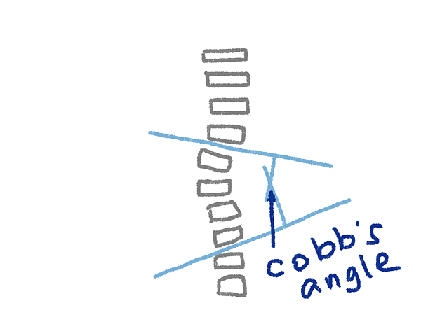在x光影像學中,脊椎側彎的角度(cob’s angle)>10度,才算是脊椎側彎。這裡不多談這種判別法(交給其他專業的醫療人員)。
