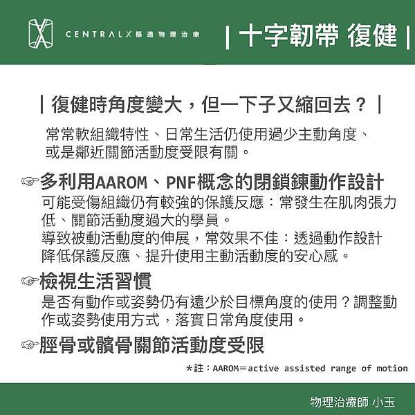 例如:有些個案在被動活動度建立的過程中,容易有肌肉收縮的現象出現,除了透過閉鎖鍊動作給予關節穩定外,亦可透過AAROM讓個案知道怎麼去使用術後的膝關節活動度。