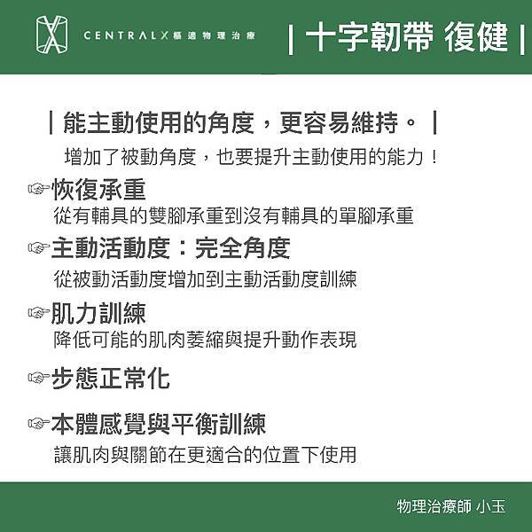 主動活動度:從被動活動度增加到主動活動度訓練,慢慢建立關節的完全角度。